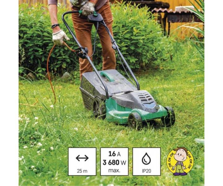 Oranžový predlžovací kábel Emos P01125 s jednou zásuvkou - spojka, s dĺžkou 25m a prierezom vodiča 1,5 mm2. Vhodný pre maximálnu záťaž 16 A. Slúži na predĺženie elektrickej energie tam, kam pevná zásuvka nedosiahne.